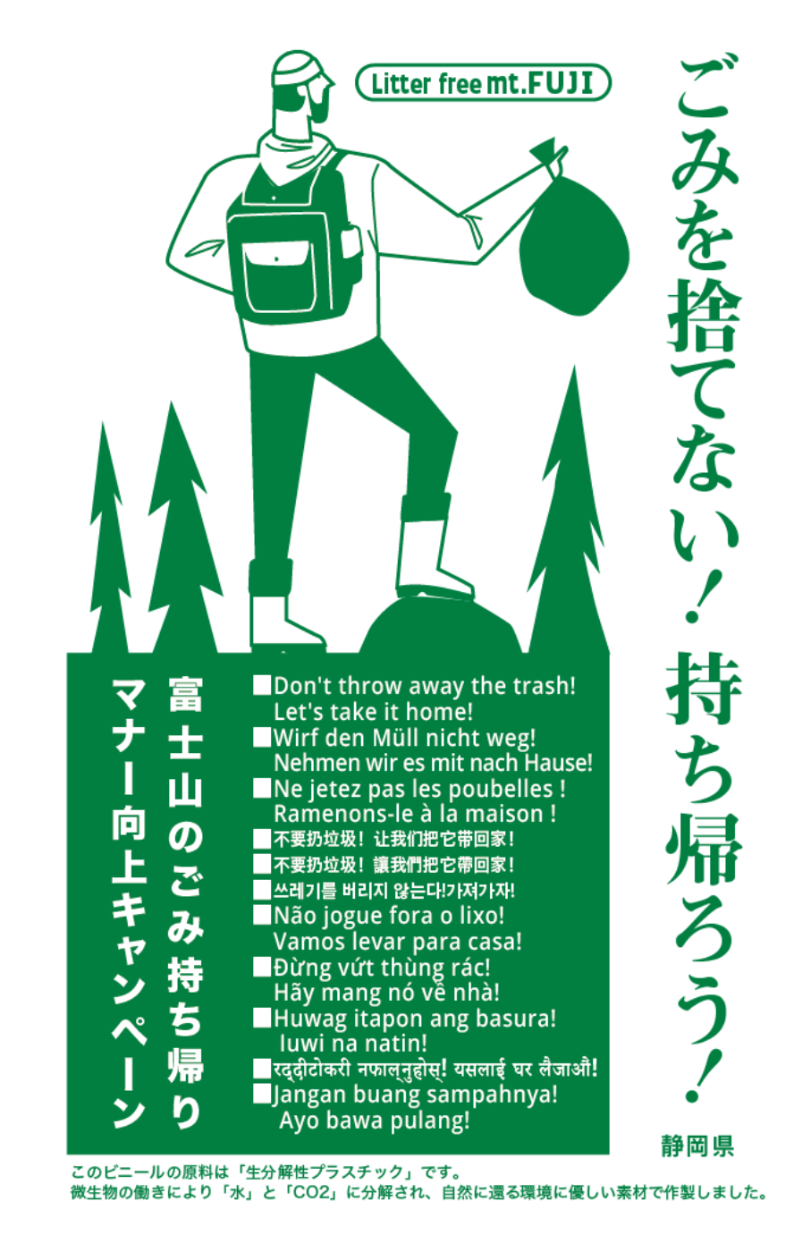 2017年夏季登山季,山路和山间小屋周围留下大量垃圾,成为大问题。作为对策,我们在2018年开始了一项改善从富士山倒垃圾的方式的活动,当我们呼吁登山者倒垃圾时,我们得到了很多人的合作,无人看管的垃圾数量减少了.在今年的登山季节,为了让富士山没有垃圾,我们将在富士山开展垃圾带走方式改善活动。我们希望所有登山者继续合作,以改善他们的举止。