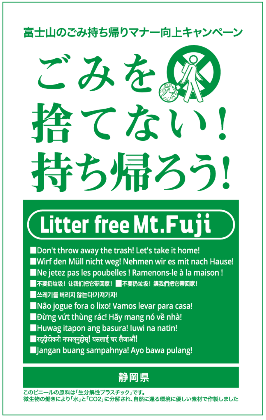 Pendant la saison estivale d'alpinisme de 2017, une grande quantité de déchets a été laissée sur les sentiers de montagne et autour des refuges de montagne, ce qui est devenu un gros problème. En guise de contre-mesure, nous avons lancé une campagne pour améliorer les manières de sortir les ordures du mont Fuji en 2018, et lorsque nous avons appelé les alpinistes à sortir les ordures, nous avons reçu la coopération de nombreuses personnes et la quantité d'ordures laissées sans surveillance a diminué. . Au cours de la saison d'alpinisme de cette année également, nous mènerons une campagne d'amélioration de la manière de retirer les ordures pour le mont Fuji afin de rendre le mont Fuji sans ordures. Nous voudrions demander à tous les grimpeurs de continuer à coopérer pour améliorer leurs manières.